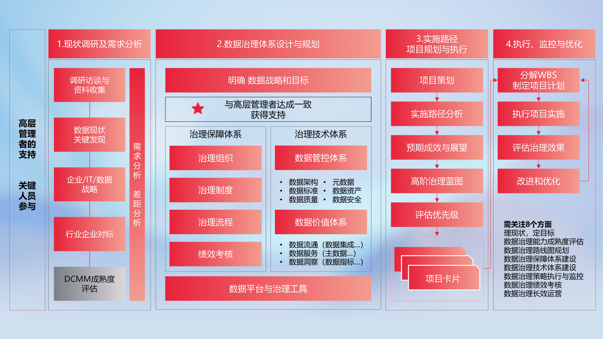 制定并执行统一的数据标准,,,规范数据定义和格式,,,消除冗余和不一致性,,,,实现跨部门和跨系统的数据一致性,,,,为企业提供标准化的数据基础。。。